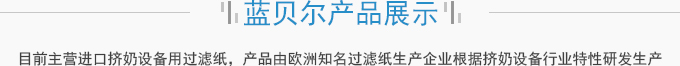 濟南藍(lán)貝爾工貿(mào)有限公司主要產(chǎn)品擠奶設(shè)備過濾紙,牛奶過濾紙,擠奶機過濾袋,目前主營進口擠奶設(shè)備用過濾紙,產(chǎn)品由歐洲知名過濾紙生產(chǎn)企業(yè)根據(jù)擠奶設(shè)備行業(yè)特性研發(fā)生產(chǎn),產(chǎn)品符合歐盟食品接觸標(biāo)準(zhǔn)及FDA食品接觸標(biāo)準(zhǔn),產(chǎn)品在擠奶設(shè)備過濾紙行業(yè)占有70%以上的份額。并通過了SGS標(biāo)準(zhǔn)技術(shù)檢測中心按國標(biāo)食品級標(biāo)準(zhǔn)進行的檢測。產(chǎn)品適用于各種擠奶設(shè)備品牌,本公司目前獲得該區(qū)域產(chǎn)品營銷資格。產(chǎn)品已用于國內(nèi)各大乳企所屬牧...